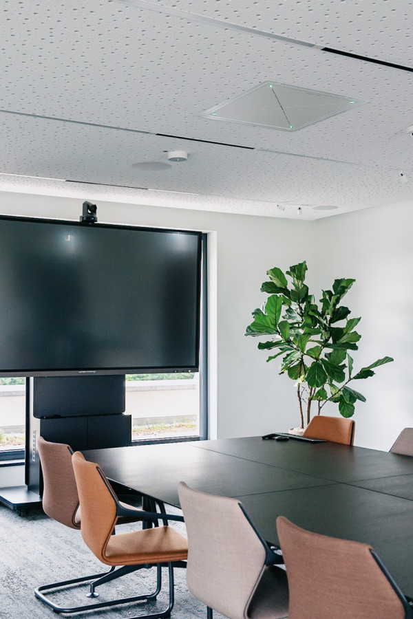 Ein Höhepunkt des Projekts ist der Highend Hybrid-Sitzungsraum. Dieser Raum ist mit zwei Highend Deckenmikrofonen ausgestattet, die eine hervorragende Tonqualität gewährleisten. Darüber hinaus sorgt eine professionelle Audioausgabe inklusive eines in die Decke eingebauten Subwoofers für ein beeindruckendes Klangerlebnis. Dies macht den Raum ideal für besonders wichtige Meetings, Präsentationen und Konferenzen.